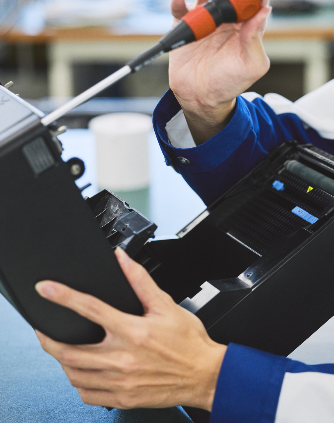 入社2年目の時、当社製プリンターをご使用中のお客様先で印刷不具合が発生し、その原因解析・対応を行ったことが特に印象に残っています。用紙にインクを転写する「インクリボン」がたるみ、印刷できなくなるという現象で原因は不明。お客様が業務に支障をきたし、お困りの状況を知り、「一刻も早く原因を突き止め、お客様の役に立ちたい」という想いで解析に臨みました。考え得る要因を徹底的に洗い出して検証を重ね、約1カ月後にようやく原因を特定。お客様が推奨外のリボンをお使いだったことに加え、リボンを巻くシャフト部品が回転不良を起こしていたことが原因でした。リボンでなく機構全体を見直したことで、本質的な原因にたどり着くことができ、無事に復旧することができました。この経験を通じて、「人の役に立ちたい」という想いこそが、技術を磨き、問題解決へ導く原動力になると実感しました。