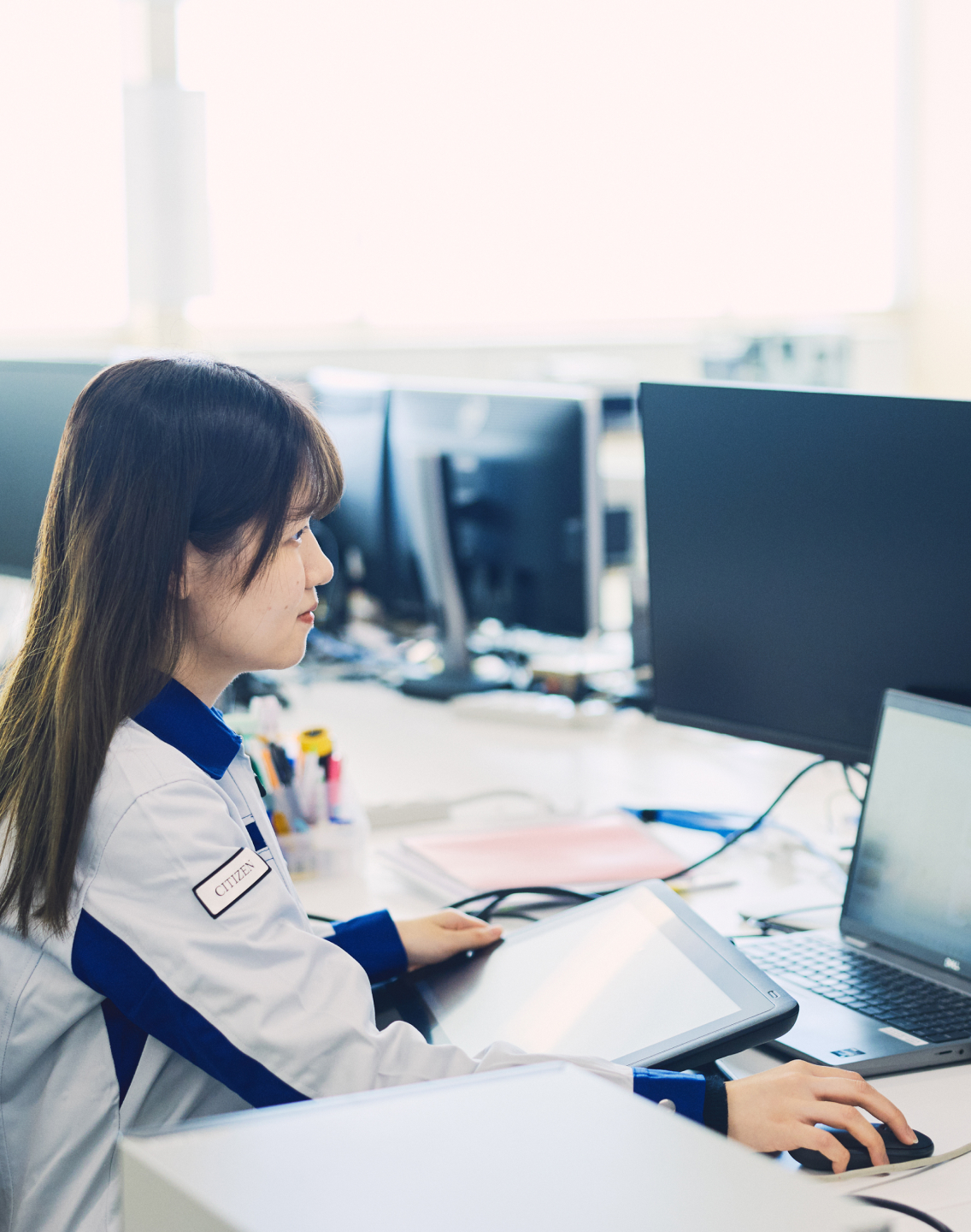 大学ではシステムデザイン工学を専攻し、3DCAD※1でドローンをモデリングしたり、“秘密基地に変化する子ども用の木工椅子”を制作したりと、デザインの観点からさまざまなものづくりに取り組みました。完成した椅子は、ボランティア団体に寄付し、使ってくれる子どもたちの笑顔を想う中で、自分のつくったもので人を喜ばせる楽しさや達成感を実感。その経験から、製品開発を通して人々の暮らしを支えたいという想いが芽生えました。大学で行われた会社説明会でシチズン・システムズを知り、腕時計の開発で培った精密技術を活かし、業務用プリンターと健康機器の分野で世界中の生活を支えている点に大きな魅力を感じました。これまでに培った発想力や技術力を活かし、ユーザー目線のものづくりに挑戦したいと考え、入社を決意しました。